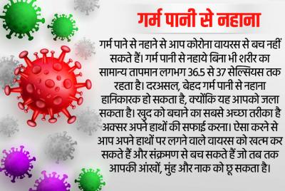 गर्म पाने से नहाने से आप कोरोना वायरस से बच नहीं सकते हैं। गर्म पानी से नहाये बिना भी शरीर का सामान्य तापमान लगभग 36.5 से 37 सेल्सियस तक रहता है। दरअसल, बेहद गर्म पानी से नहाना हानिकारक हो सकता है, क्योंकि यह आपको जला सकता है। खुद को बचाने का सबसे अच्छा तरीका है अक्सर अपने हाथों की सफाई करना। ऐसा करने से आप अपने हाथों पर लगने वाले वायरस को खत्म कर सकते हैं और संक्रमण से बच सकते हैं जो तब तक आपकी आंखों, मुंह और नाक को छू सकता है।