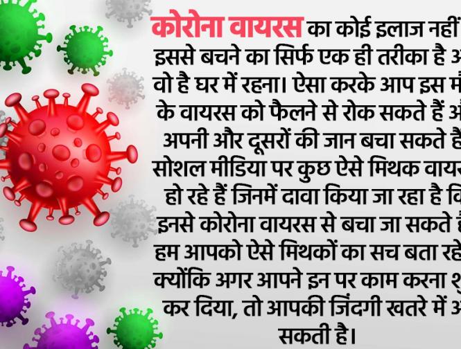 कोरोना वायरस का कोई इलाज नहीं है। इससे बचने का सिर्फ एक ही तरीका है और वो है घर में रहना। ऐसा करके आप इस मौत के वायरस को फैलने से रोक सकते हैं और अपनी और दूसरों की जान बचा सकते हैं। सोशल मीडिया पर कुछ ऐसे मिथक वायरल हो रहे हैं जिनमें दावा किया जा रहा है कि इनसे कोरोना वायरस से बचा जा सकते है। हम आपको ऐसे मिथकों का सच बता रहे हैं क्योंकि अगर आपने इन पर काम करना शुरू कर दिया, तो आपकी जिंदगी खतरे में आ सकती है।