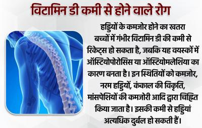 हड्डियों के कमजोर होने का खतरा बच्चों में गंभीर विटामिन डी की कमी से रिकेट्स हो सकता है, जबकि यह वयस्कों में ऑस्टियोपोरोसिस या ऑस्टियोमलेशिया का कारण बनता है। इन स्थितियों को कमजोर, नरम हड्डियों, कंकाल की विकृति, मांसपेशियों की कमजोरी आदि द्वारा चिह्नित किया जाता है। इसकी कमी से हड्डियां अत्यधिक दुर्बल हो सकती हैं।