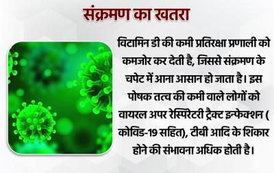 विटामिन डी की कमी प्रतिरक्षा प्रणाली को कमजोर कर देती है, जिससे संक्रमण के चपेट में आना आसान हो जाता है। इस पोषक तत्व की कमी वाले लोगों को वायरल अपर रेस्पिरेटरी ट्रैक्ट इन्फेक्शन ( कोविड-19 सहित), टीबी आदि के शिकार होने की संभावना अधिक होती है।