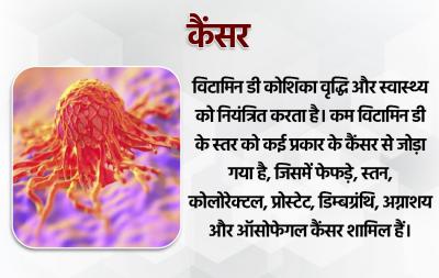 विटामिन डी कोशिका वृद्धि और स्वास्थ्य को नियंत्रित करता है। कम विटामिन डी के स्तर को कई प्रकार के कैंसर से जोड़ा गया है, जिसमें फेफड़े, स्तन, कोलोरेक्टल, प्रोस्टेट, डिम्बग्रंथि, अग्नाशय और ऑसोफेगल कैंसर शामिल हैं।
