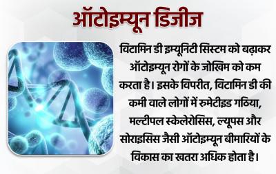 विटामिन डी इम्यूनिटी सिस्टम को बढ़ाकर ऑटोइम्यून रोगों के जोखिम को कम करता है। इसके विपरीत, विटामिन डी की कमी वाले लोगों में रुमेटीइड गठिया, मल्टीपल स्केलेरोसिस, ल्यूपस और सोराइसिस जैसी ऑटोइम्यून बीमारियों के विकास का खतरा अधिक होता है।