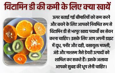 ओपर बताये गए खतरों को कम करने और बचने के लिए आपको नियमित रूप से विटामिन डी से भरपूर खाद्य पदार्थों का सेवन करना चाहिए। इसके लिए आप अपनी डाइट में दूध, पनीर और दही, वसायुक्त मछली, अंडे और मशरूम जैसे डेयरी उत्पादों को शामिल कर सकते हैं। इसके अलावा आपको सुबह की धूप लेनी चाहिए।