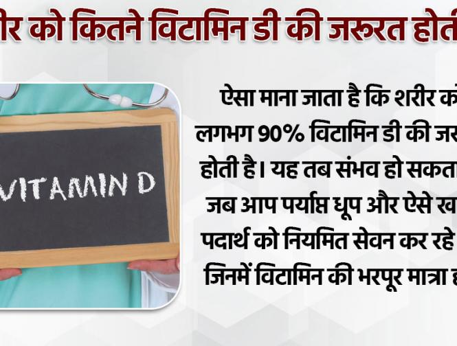 ऐसा माना जाता है कि शरीर को लगभग 90% विटामिन डी की जरूरत होती है। यह तब संभव हो सकता है, जब आप पर्याप्त धूप और ऐसे खाद्य पदार्थ को नियमित सेवन कर रहे हों, जिनमें विटामिन की भरपूर मात्रा हो।