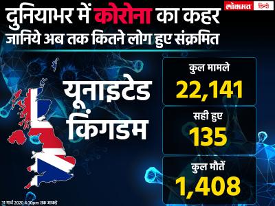यूनाइटेड किंगडम में कुल मामले हैं 22141, सही हुए 135, कुल मौतें 1408