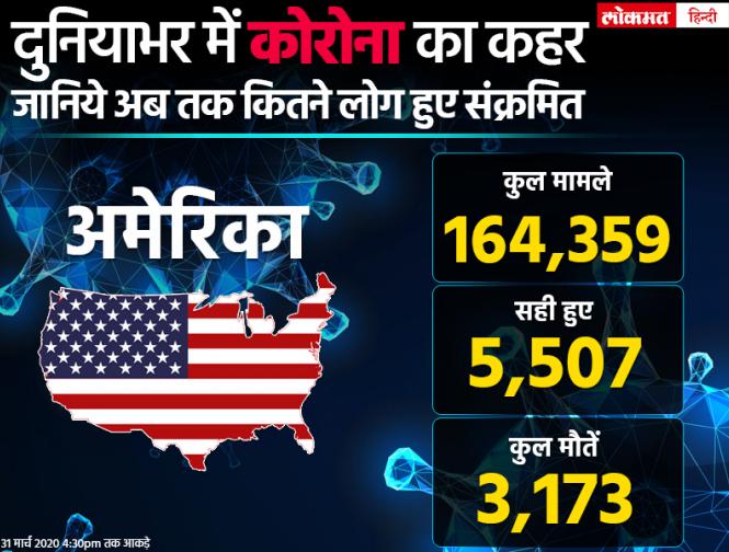 अमेरिका में कुल मामले हैं 164359, सही हुए 5507, कुल मौतें 3173