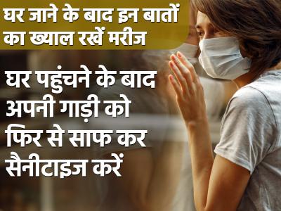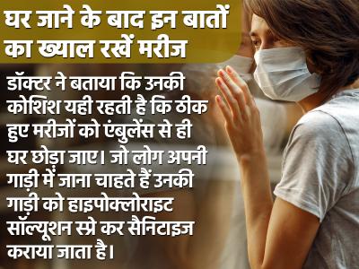 डॉक्टर ने बताया कि उनकी कोशिश यही रहती है कि ठीक हुए मरीजों को एंबुलेंस से ही घर छोड़ा जाए। जो लोग अपनी गाड़ी में जाना चाहते हैं उनकी गाड़ी को हाइपोक्लोराइट सॉल्यूशन स्प्रे कर सैनिटाइज कराया जाता है।