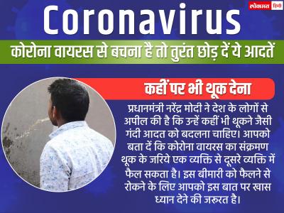 प्रधानमंत्री नरेंद्र मोदी ने देश के लोगों से अपील की है कि उन्हें कहीं भी थूकने जैसी गंदी आदत को बदलना चाहिए। आपको बता दें कि कोरोना वायरस का संक्रमण थूक के जरिये एक व्यक्ति से दूसरे व्यक्ति में फैल सकता है। इस बीमारी को फैलने से रोकने के लिए आपको इस बात पर खास ध्यान देने की जरूरत है।