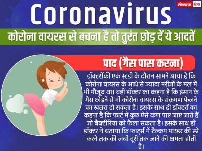डॉक्टरोंकी एक स्टडी के दौरान सामने आया है कि कोरोना वायरस के आधे से ज्यादा मरीजों के मल में भी मौजूद था। वहीं डॉक्टर का कहना है कि इंसान के गैस छोड़ने से भी कोरोना वायरस के संक्रमण फैलने का खतरा हो सकता है। इसके साथ ही डॉक्टरों का कहना है कि फार्ट में कुछ ऐसे कण पाए जाए जाते हैं जो बैक्टीरिया को फैला सकता है। इसके साथ ही डॉक्टर ने बताया कि फार्ट्स में टैल्कम पाउडर की स्प्रे करने तक की लंबी दूरी तक जाने की क्षमता होती है।