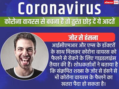 जागरण की एक रिपोर्ट के अनुसार, आईसीएमआर और एम्स के डॉक्टरों के साथ मिलकर कोरोना वायरस को फैलने से रोकने के लिए गाइडलाइंस तैयार की हैं। शोधकर्ताओं ने बताया है कि संक्रमित शख्स के जोर से हंसने से भी कोरोना वायरस के फैलने का खतरा पैदा हो सकता है।