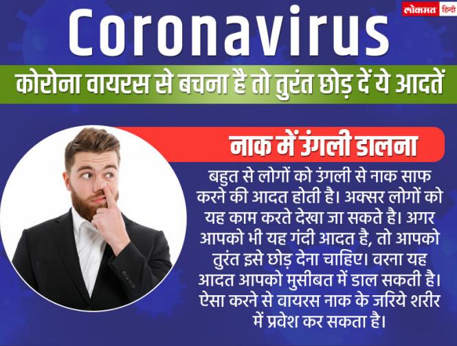 बहुत से लोगों को उंगली से नाक साफ करने की आदत होती है। अक्सर लोगों को यह काम करते देखा जा सकते है। अगर आपको भी यह गंदी आदत है, तो आपको तुरंत इसे छोड़ देना चाहिए। वरना यह आदत आपको मुसीबत में डाल सकती है। ऐसा करने से वायरस नाक के जरिये शरीर में प्रवेश कर सकता है।