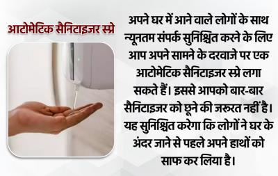 अपने घर में आने वाले लोगों के साथ न्यूनतम संपर्क सुनिश्चित करने के लिए आप अपने सामने के दरवाजे पर एक आटोमेटिक सैनिटाइजर स्प्रे लगा सकते हैं। इससे आपको बार-बार सैनिटाइजर को छूने की जरूरत नहीं है। यह सुनिश्चित करेगा कि लोगों ने घर के अंदर जाने से पहले अपने हाथों को साफ कर लिया है।