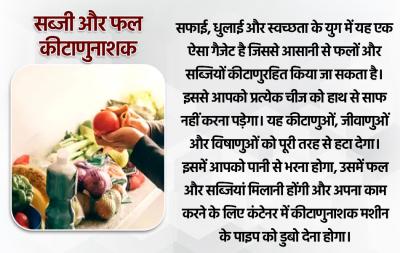 सफाई, धुलाई और स्वच्छता के युग में यह एक ऐसा गैजेट है जिससे आसानी से फलों और सब्जियों कीटाणुरहित किया जा सकता है। इससे आपको प्रत्येक चीज को हाथ से साफ नहीं करना पड़ेगा। यह कीटाणुओं, जीवाणुओं और विषाणुओं को पूरी तरह से हटा देगा। इसमें आपको पानी से भरना होगा, उसमें फल और सब्जियां मिलानी होंगी और अपना काम करने के लिए कंटेनर में कीटाणुनाशक मशीन के पाइप को डुबो देना होगा।