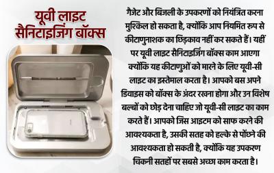 गैजेट और बिजली के उपकरणों को नियंत्रित करना मुश्किल हो सकता है, क्योंकि आप नियमित रूप से कीटाणुनाशक का छिड़काव नहीं कर सकते हैं। यहीं पर यूवी लाइट सैनिटाइजिंग बॉक्स काम आएगा क्योंकि यह कीटाणुओं को मारने के लिए यूवी-सी लाइट का इस्तेमाल करता है। आपको बस अपने डिवाइस को बॉक्स के अंदर रखना होगा और उन विशेष बल्बों को छोड़ देना चाहिए जो यूवी-सी लाइट का काम करते हैं। आपको जिस आइटम को साफ करने की आवश्यकता है, उसकी सतह को हल्के से पोंछने की आवश्यकता हो सकती है, क्योंकि यह उपकरण चिकनी सतहों पर सबसे अच्छा काम करता है।