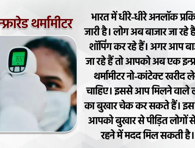 भारत में धीरे-धीरे अनलॉक प्रकिया जारी है। लोग अब बाजार जा रहे हैं और शॉपिंग कर रहे हैं। अगर आप बाजार जा रहे हैं तो आपको अब एक इन्फ्रारेड थर्मामीटर नो-कांटेक्ट खरीद लेना चाहिए। इससे आप मिलने वाले लोगों का बुखार चेक कर सकते हैं। इस तरह आपको बुखार से पीड़ित लोगों से दूर रहने में मदद मिल सकती है।