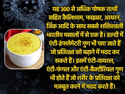 यह 300 से अधिक पोषक तत्वों सहित कैल्शियम, फाइबर, आयरन, जिंक आदि के साथ सबसे शक्तिशाली भारतीय मसालों में से एक है। हल्दी में एंटी-इंफ्लेमेटरी गुण भी पाए जाते हैं जो प्रतिरक्षा को बढ़ाने में मदद कर सकते हैं। इसमें एंटी-वायरल, एंटी-फंगल और एंटी-बैक्टीरियल गुण भी होते हैं जो शरीर के प्रतिरक्षा को मजबूत करने में मदद करते हैं।