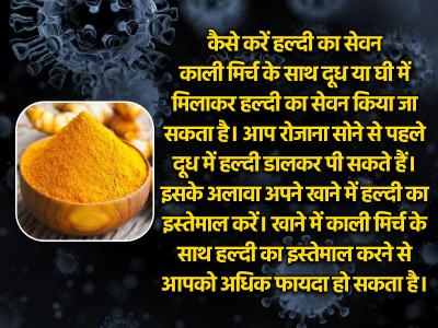काली मिर्च के साथ दूध या घी में मिलाकर हल्दी का सेवन किया जा सकता है। आप रोजाना सोने से पहले दूध में हल्दी डालकर पी सकते हैं। इसके अलावा अपने खाने में हल्दी का इस्तेमाल करें। खाने में काली मिर्च के साथ हल्दी का इस्तेमाल करने से आपको अधिक फायदा हो सकता है।