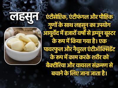 एंटीसेप्टिक, एंटीफंगल और पौष्टिक गुणों के साथ लहसुन का उपयोग आयुर्वेद में हजारों वर्षों से इम्यून बूस्टर के रूप में किया गया है। एक पावरफुल और नैचुरल एंटीऑक्सिडेंट के रूप में काम करके शरीर को बैक्टीरिया और वायरल संक्रमण से बचाने के लिए जाना जाता है।
