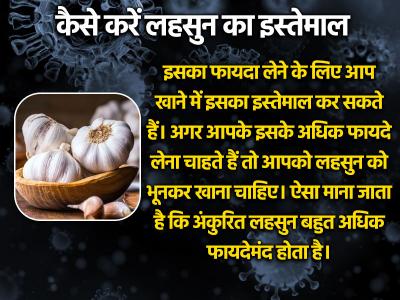 इसका फायदा लेने के लिए आप खाने में इसका इस्तेमाल कर सकते हैं। अगर आपके इसके अधिक फायदे लेना चाहते हैं तो आपको लहसुन को भूनकर खाना चाहिए। ऐसा माना जाता है कि अंकुरित लहसुन बहुत अधिक फायदेमंद होता है।