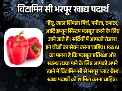 नींबू, लाल शिमला मिर्च, पपीता, टमाटर, आदि इम्यून सिस्टम मजबूत करने के लिए जाने जाते हैं। सर्दियों में आपको रोजाना इन चीजों का सेवन करना चाहिए। FSSAI का मानना है कि मजबूत प्रतिरक्षा और स्वस्थ त्वचा पाने के लिए आपको अपने खाने में विटामिन-सी से भरपूर प्लांट बेस्ड खाद्य पदार्थों को शामिल करना चाहिए।