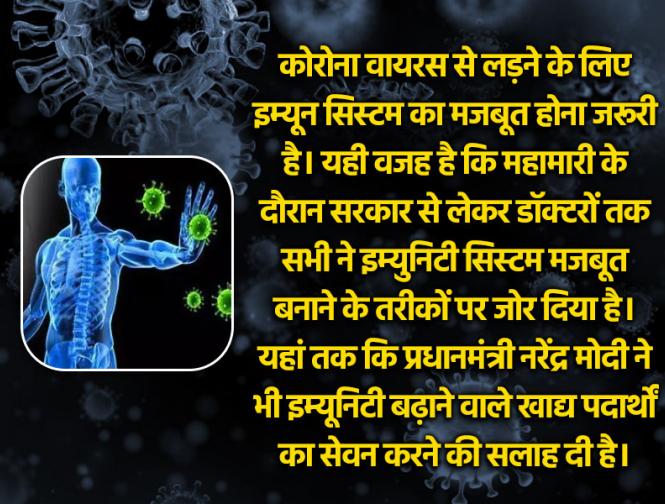 कोरोना वायरस से लड़ने के लिए इम्यून सिस्टम का मजबूत होना जरूरी है। यही वजह है कि महामारी के दौरान सरकार से लेकर डॉक्टरों तक सभी ने इम्युनिटी सिस्टम मजबूत बनाने के तरीकों पर जोर दिया है। यहां तक कि प्रधानमंत्री नरेंद्र मोदी ने भी इम्यूनिटी बढ़ाने वाले खाद्य पदार्थों का सेवन करने की सलाह दी है।