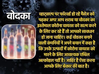 व्हाट्सएप पर फॉरवर्ड हो रहे मैसेज को पढ़कर अगर आप शराब या वोदका का इस्तेमाल कोरोना वायरस को खत्म करने के लिए कर रहे हैं तो आपको सावधान हो जाना चाहिए। कई वोडका बनाने वाली कंपनियों ने अपने बयान में कहा है कि उनके उत्पादों में कोरोना वायरस को मारने के लिए आवश्यक एथिल अल्कोहल नहीं है। जाहिर है ऐसा करना आपके लिए बेकार की बात है।