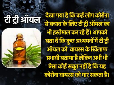 देखा गया है कि कई लोग कोरोना से बचाव के लिए टी ट्री ऑयल का भी इस्तेमाल कर रहे हैं। आपको बता दें कि कुछ अध्ययनों में टी ट्री ऑयल को वायरस के खिलाफ प्रभावी बताया है लेकिन अभी भी ऐसा कोई सबूत नहीं है कि यह कोरोना वायरस को मार सकता है।