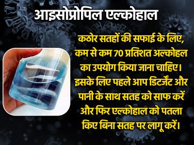 कठोर सतहों की सफाई के लिए, कम से कम 70 प्रतिशत अल्कोहल का उपयोग किया जाना चाहिए। इसके लिए पहले आप डिटर्जेंट और पानी के साथ सतह को साफ करें और फिर एल्कोहाल को पतला किए बिना सतह पर लागू करें।