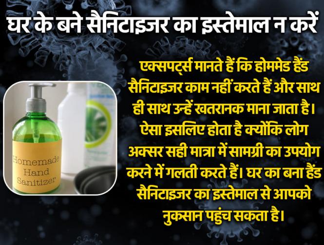 एक्सपर्ट्स मानते हैं कि होममेड हैंड सैनिटाइजर काम नहीं करते हैं और साथ ही साथ उन्हें खतरानक माना जाता है। ऐसा इसलिए होता है क्योंकि लोग अक्सर सही मात्रा में सामग्री का उपयोग करने में गलती करते हैं। घर का बना हैंड सैनिटाइजर का इस्तेमाल से आपको नुकसान पहुंच सकता है।