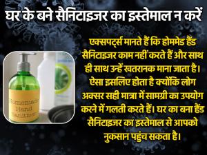 1 / 7एक्सपर्ट्स मानते हैं कि होममेड हैंड सैनिटाइजर काम नहीं करते हैं और साथ ही साथ उन्हें खतरानक माना जाता है। ऐसा इसलिए होता है क्योंकि लोग अक्सर सही मात्रा में सामग्री का उपयोग करने में गलती करते हैं। घर का बना हैंड सैनिटाइजर का इस्तेमाल से आपको नुकसान पहुंच सकता है। 2 / 7व्हाट्सएप पर फॉरवर्ड हो रहे मैसेज को पढ़कर अगर आप शराब या वोदका का इस्तेमाल कोरोना वायरस को खत्म करने के लिए कर रहे हैं तो आपको सावधान हो जाना चाहिए। कई वोडका बनाने वाली कंपनियों ने अपने बयान में कहा है कि उनके उत्पादों में कोरोना वायरस को मारने के लिए आवश्यक एथिल अल्कोहल नहीं है। जाहिर है ऐसा करना आपके लिए बेकार की बात है। 3 / 7देखा गया है कि कई लोग कोरोना से बचाव के लिए टी ट्री ऑयल का भी इस्तेमाल कर रहे हैं। आपको बता दें कि कुछ अध्ययनों में टी ट्री ऑयल को वायरस के खिलाफ प्रभावी बताया है लेकिन अभी भी ऐसा कोई सबूत नहीं है कि यह कोरोना वायरस को मार सकता है। 4 / 7रोग नियंत्रण और रोकथाम केंद्र (सीडीसीपी) वायरस को नष्ट करने के लिए एक पतले ब्लीच का उपयोग करने की सलाह देता है। वायरस को मारने का सही मिश्रण बनाने के लिए एक गैलन पानी के साथ आधा कप ब्लीच मिलाएं। 5 / 7कठोर सतहों की सफाई के लिए, कम से कम 70 प्रतिशत अल्कोहल का उपयोग किया जाना चाहिए। इसके लिए पहले आप डिटर्जेंट और पानी के साथ सतह को साफ करें और फिर एल्कोहाल को पतला किए बिना सतह पर लागू करें। 6 / 7सेंटर फॉर डिजीज कंट्रोल एंड प्रिवेंशन के अनुसार, 3 प्रतिशत हाइड्रोजन पेरोक्साइड राइनोवायरस को मारने में प्रभावी है। जो लोग नहीं जानते हैं, उनके लिए राइनोवायरस को कोरोनावायरस की तुलना में मारना अधिक कठिन है, इसलिए हाइड्रोजन पेरोक्साइड कोरोना वायरस को और भी आसानी से तोड़ सकता है। 7 / 7हमने अब तक इसे लाखों बार पढ़ा और सुना है कि साबुन और पानी से हाथ धोना कोरोना से बचने का सबसे आसान तरीका है। वायरस को नष्ट करने के लिए अपने हाथों को कम से कम 20 सेकंड के लिए साबुन और पानी से धोएं। आप किसी भी साबुन का उपयोग कर सकते हैं।