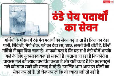 गर्मियों के मौसम में ठंडे पेय पदार्थों का सेवन बढ़ जाता है। फ्रिज का ठंडा पानी, शिकंजी, मैंगो शेक, गन्ने का ठंडा रस, छाछ, लस्सी ऐसी चीजें हैं, जिन्हें गर्मियों में खूब पिया जाता है। आपको बता दें कि यह सभी ठंडी चीजें आपके गले के लिए नुकसानदायक हो सकती हैं। बताया जा रहा है कि कोरोना वायरस गले को ज्यादा प्रभावित करता है और यही वजह है कि एक्सपर्ट्स गले को साफ रखने की सलाह दे रहे हैं। इसलिए अगर आप इन चीजों का सेवन कर रहे हैं, तो चेक कर लें कि वो ज्यादा ठंडी तो नहीं हैं।