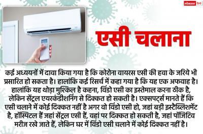 कई अध्ययनों में दावा किया गया है कि कोरोना वायरस एसी की हवा के जरिये भी प्रसारित हो सकता है। हालांकि कई रिसर्च में कहा गया है कि यह एक अफवाह है। हालांकि यह थोड़ा मुश्किल है कहना, विंडो एसी का इस्तेमाल करना ठीक है, लेकिन सेंट्रल एयरकंडीशनिंग से दिक्कत हो सकती है। एक्सपर्ट्स मानते हैं कि एसी चलाने में कोई दिक्कत नहीं है अगर वो विंडो एसी हो, जहां बड़ी इस्टैब्लिशमेंट है, हॉस्पिटल हैं जहां सेंट्रल एसी हैं, वहां पर दिक्कत हो सकती है, जहां पॉजिटिव मरीज रखे जाते हैं, लेकिन घर में विंडो एसी चलाने में कोई दिक्कत नहीं है।