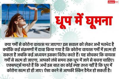 क्या गर्मी से कोरोना वायरस मर जाएगा? इस सवाल को लेकर अभी मतभेद है क्योंकि कई संक्रमणों में दावा किया गया है कि कोरोना वायरस गर्मी में ख़त्म हो सकता है जबकि कई अध्ययन इसका विरोध करते हैं। यह सोचकर कि वायरस गर्मी से खत्म हो जाएगा, आपको लंबे समय तक धूप में जाने से बचना चाहिए। एक्सपर्ट्स मानते हैं कि अभी इस बात का कोई स्पष्ट तथ्य नहीं है कि धूप में कोरोना खत्म हो ही जाए। ऐसा करने से आपकी स्किन डैमेज हो सकती है।