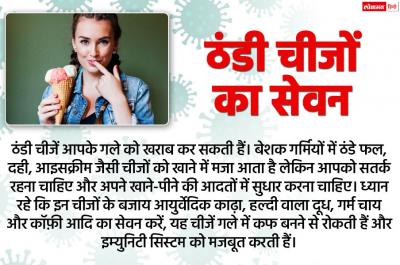 ठंडी चीजें आपके गले को खराब कर सकती हैं। बेशक गर्मियों में ठंडे फल, दही, आइसक्रीम जैसी चीजों को खाने में मजा आता है लेकिन आपको सतर्क रहना चाहिए और अपने खाने-पीने की आदतों में सुधार करना चाहिए। ध्यान रहे कि इन चीजों के बजाय आयुर्वेदिक काढ़ा, हल्दी वाला दूध, गर्म चाय और कॉफ़ी आदि का सेवन करें, यह चीजें गले में कफ बनने से रोकती हैं और इम्युनिटी सिस्टम को मजबूत करती हैं।