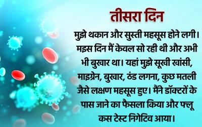 मुझे थकान और सुस्ती महसूस होने लगी। मइस दिन मैं केवल सो रही थी और अभी भी बुखार था। यहां मुझे सूखी खांसी, माइग्रेन, बुखार, ठंड लगना, कुछ मतली जैसे लक्षण महसूस हुए। मैंने डॉक्टरों के पास जाने का फैसला किया और फ्लू कस टेस्ट निगेटिव आया।