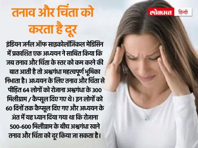 इंडियन जर्नल ऑफ साइकोलॉजिकल मेडिसिन में प्रकाशित एक अध्ययन ने साबित किया कि जब तनाव और चिंता के स्तर को कम करने की बात आती है तो अश्वगंधा महत्वपूर्ण भूमिका निभाता है। अध्ययन के लिए तनाव और चिंता से पीड़ित 64 लोगों को रोजाना अश्वगंधा के 300 मिलीग्राम / कैप्सूल दिए गए थे। इन लोगों को 60 दिनों तक कैप्सूल दिए गए और अध्ययन के अंत में यह ध्यान दिया गया था कि रोजाना 500-600 मिलीग्राम के बीच अश्वगंधा खाने तनाव और चिंता को दूर किया जा सकता है।