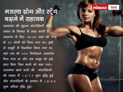 जर्नल ऑफ़ इंटरनेशनल सोसाइटी ऑफ स्पोर्ट्स न्यूट्रीशन द्वारा किए गए एक अध्ययन से पता चला कि अश्वगंधा की खुराक मांसपेशियों और ताकत के विकास में मदद करती है। अध्ययन के लिए 18-50 साल की आयु के 57 लोगों को लिया गया था। इन्हें दो समूहों में विभाजित किया गया था, जहां एक को 600 मिलीग्राम अश्वगंधा दिया गया था और एक समूह को इसे खाए बिना जिम करने को कहा गया। अश्वगंधा खाने वालों की मांसपेशियों की ताकत में 1.5-1.7 गुना वृद्धि हुई और मांसपेशियों के आकार में 1.6-2.3 गुना अधिक वृद्धि हुई।
