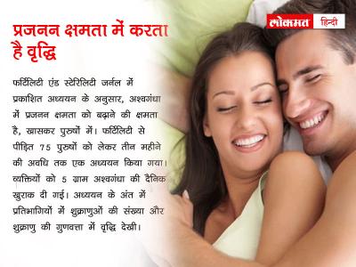 फर्टिलिटी एंड स्टेरिलिटी जर्नल में प्रकाशित अध्ययन के अनुसार, अश्वगंधा में प्रजनन क्षमता को बढ़ाने की क्षमता है, खासकर पुरुषों में। फर्टिलिटी से पीड़ित 75 पुरुषों को लेकर तीन महीने की अवधि तक एक अध्ययन किया गया। व्यक्तियों को 5 ग्राम अश्वगंधा की दैनिक खुराक दी गई। अध्ययन के अंत में प्रतिभागियों में शुक्राणुओं की संख्या और शुक्राणु की गुणवत्ता में वृद्धि देखी।