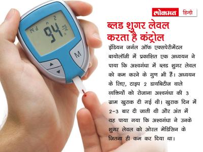 इंडियन जर्नल ऑफ एक्सपेरीमेंटल बायोलॉजी में प्रकाशित एक अध्ययन ने पाया कि अश्वगंधा में ब्लड शुगर लेवल को कम करने के गुण भी हैं। अध्ययन के लिए, टाइप 2 डायबिटीज वाले व्यक्तियों को रोजाना अश्वगंधा की 3 ग्राम खुराक दी गई थी। खुराक दिन में 2-3 बार दी जाती थी और अंत में यह पाया गया कि अश्वगंधा ने उनके शुगर लेवल को ओरल मेडिसिन के जितना ही कम कर दिया था।