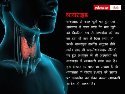थायराइड से ग्रस्त चूहों पर हुए एक अध्ययन में पाया गया कि जब चूहों को नियमित रूप से अश्वगंधा की जड़ को दवा के रूप में दिया गया तो उनके थायराइड हार्मोंस संतुलन होने लगे।