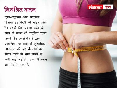 स्वस्थ रहने के साथ ही वजन भी संतुलित रहना जरूरी है। अश्वगंधा की जड़ के अर्क का सेवन करने से भूख लगने में कमी पाई गई है और ये वजन भी नियंत्रित करता है।
