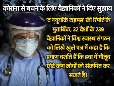 'द न्यूयॉर्क टाइम्स' की रिपोर्ट के मुताबिक, 32 देशों के 239 वैज्ञानिकों ने विश्व स्वास्थ्य संगठन को लिखे खुले पत्र में कहा है कि प्रमाण दर्शाते हैं कि हवा में मौजूद छोटे कण लोगों को संक्रमित कर सकते हैं।