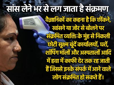 वैज्ञानिकों का कहना है कि छींकने, खांसने या जोर से बोलने पर संक्रमित व्यक्ति के मुंह से निकली छोटी सूक्ष्म बूंदें कार्यालयों, घरों, शॉपिंग मॉलों और अस्पतालों आदि में हवा में काफी देर तक रह जाती हैं जिससे इनके संपर्क में आने वाले लोग संक्रमित हो सकते हैं।