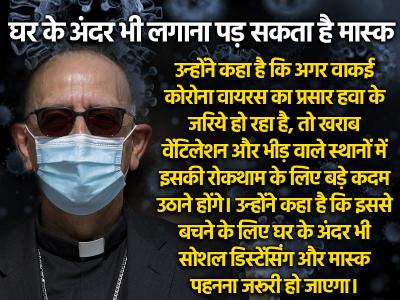उन्होंने कहा है कि अगर वाकई कोरोना वायरस का प्रसार हवा के जरिये हो रहा है, तो खराब वेंटिलेशन और भीड़ वाले स्थानों में इसकी रोकथाम के लिए बड़े कदम उठाने होंगे। उन्होंने कहा है कि इससे बचने के लिए घर के अंदर भी सोशल डिस्टेंसिंग और मास्क पहनना जरूरी हो जाएगा।