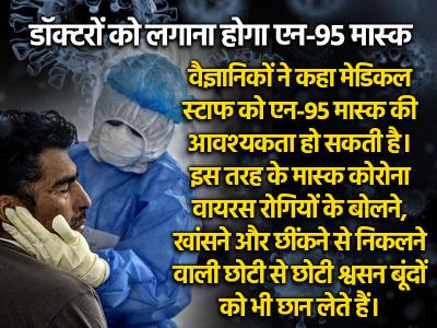 वैज्ञानिकों ने कहा मेडिकल स्टाफ को एन-95 मास्क की आवश्यकता हो सकती है। इस तरह के मास्क कोरोना वायरस रोगियों के बोलने, खांसने और छींकने से निकलने वाली छोटी से छोटी श्वसन बूंदों को भी छान लेते हैं।
