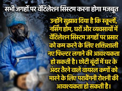 उन्होंने सुझाव दिया है कि स्कूलों, नर्सिंग होम, घरों और व्यवसायों में वेंटिलेशन सिस्टम जगहों पर प्रसार को कम करने के लिए शक्तिशाली नए फिल्टर लगाने की आवश्यकता हो सकती है। छोटी बूंदों में घर के अंदर तैरने वाले वायरल कणों को मारने के लिए पराबैंगनी रोशनी की आवश्यकता हो सकती है।