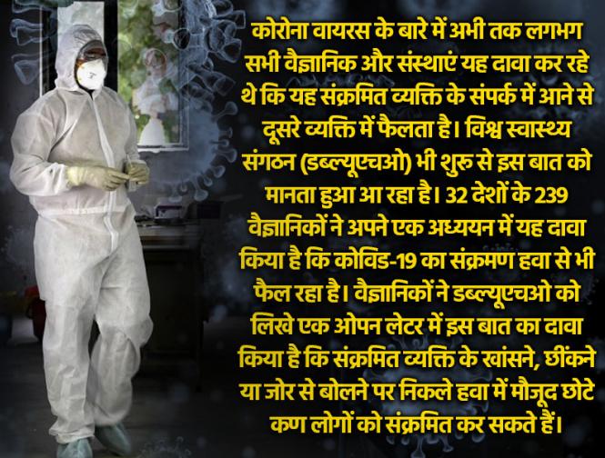 कोरोना वायरस के बारे में अभी तक लगभग सभी वैज्ञानिक और संस्थाएं यह दावा कर रहे थे कि यह संक्रमित व्यक्ति के संपर्क में आने से दूसरे व्यक्ति में फैलता है। विश्व स्वास्थ्य संगठन (डब्ल्यूएचओ) भी शुरू से इस बात को मानता हुआ आ रहा है। लेकिन अब 32 देशों के 239 वैज्ञानिकों ने अपने एक अध्ययन में यह दावा किया है कि कोविड-19 का संक्रमण हवा से भी फैल रहा है।