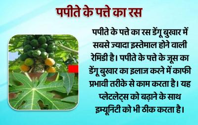पपीते के पत्ते का रस डेंगू बुखार में सबसे ज्यादा इस्तेमाल होने वाली रेमिडी है। पपीते के पत्ते के जूस का डेंगू बुखार का इलाज करने में काफी प्रभावी तरीके से काम करता है। यह प्लेटलेट्स को बढ़ाने के साथ इम्यूनिटी को भी ठीक करता है।