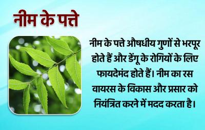 नीम के पत्ते औषधीय गुणों से भरपूर होते हैं और डेंगू के रोगियों के लिए फायदेमंद होते हैं। नीम का रस वायरस के विकास और प्रसार को नियंत्रित करने में मदद करता है।