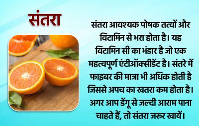 संतरा आवश्यक पोषक तत्वों और विटामिन से भरा होता है। यह विटामिन सी का भंडार है जो एक महत्वपूर्ण एंटीऑक्सीडेंट है। संतरे में फाइबर की मात्रा भी अधिक होती है जिससे अपच का खतरा कम होता है। अगर आप डेंगू से जल्दी आराम पाना चाहते हैं, तो संतरा जरूर खायें।